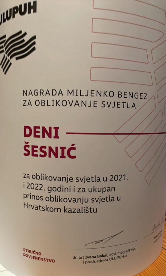 Nagrada za oblikovanje svjetla u 2021. i 2022. godini i za ukupan prinos oblikovanju svjetla u Hrvatskom kazalištu.