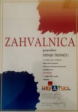 Zahvalnica Hrvatske turističke zajednice za sudjelovanje u realizaciji umjetničkog programa svečanog otvaranja međunarodne turističke burze ITB Berlin, 2003.