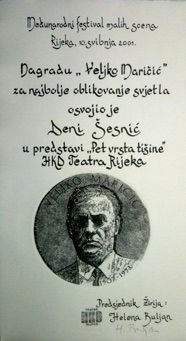 Nagrada za najbolje oblikovanje svjetla za predstavu "ŠUMA STRIBOROVA" Gradskog Kazališta Lutaka Rijeka.